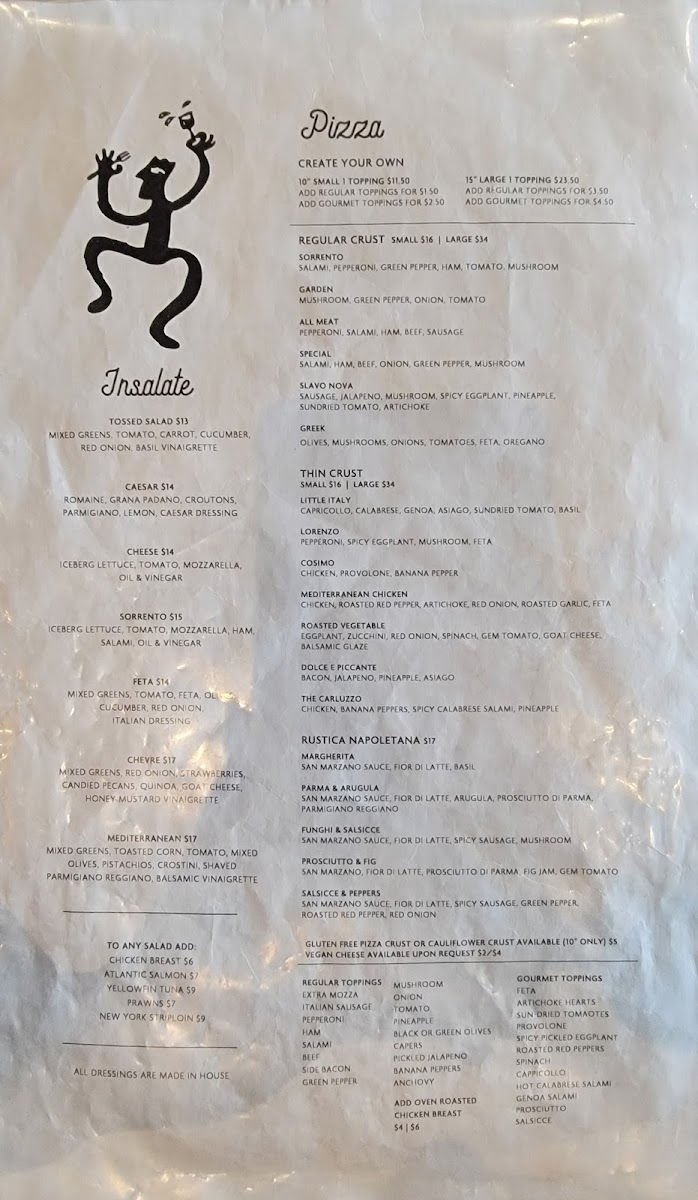 The Insalate section features refreshing salads like the Chevre Salad with mixed greens, candied pecans, and goat cheese, and the Sorrento Salad with iceberg lettuce, mozzarella, and savory meats. These salads are perfect for a late-night snack or light dinner.